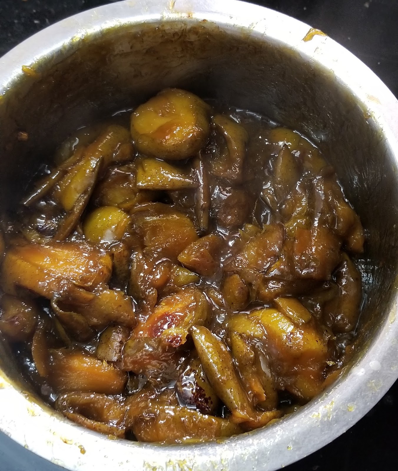 1. Cut the ripe mangoes into small pieces. Put these mango pieces along with the seed into a big vessel. Add one cup of water, turmeric powder and salt to it . Boil this in medium to low flame till the mangoes are soft and cooked.